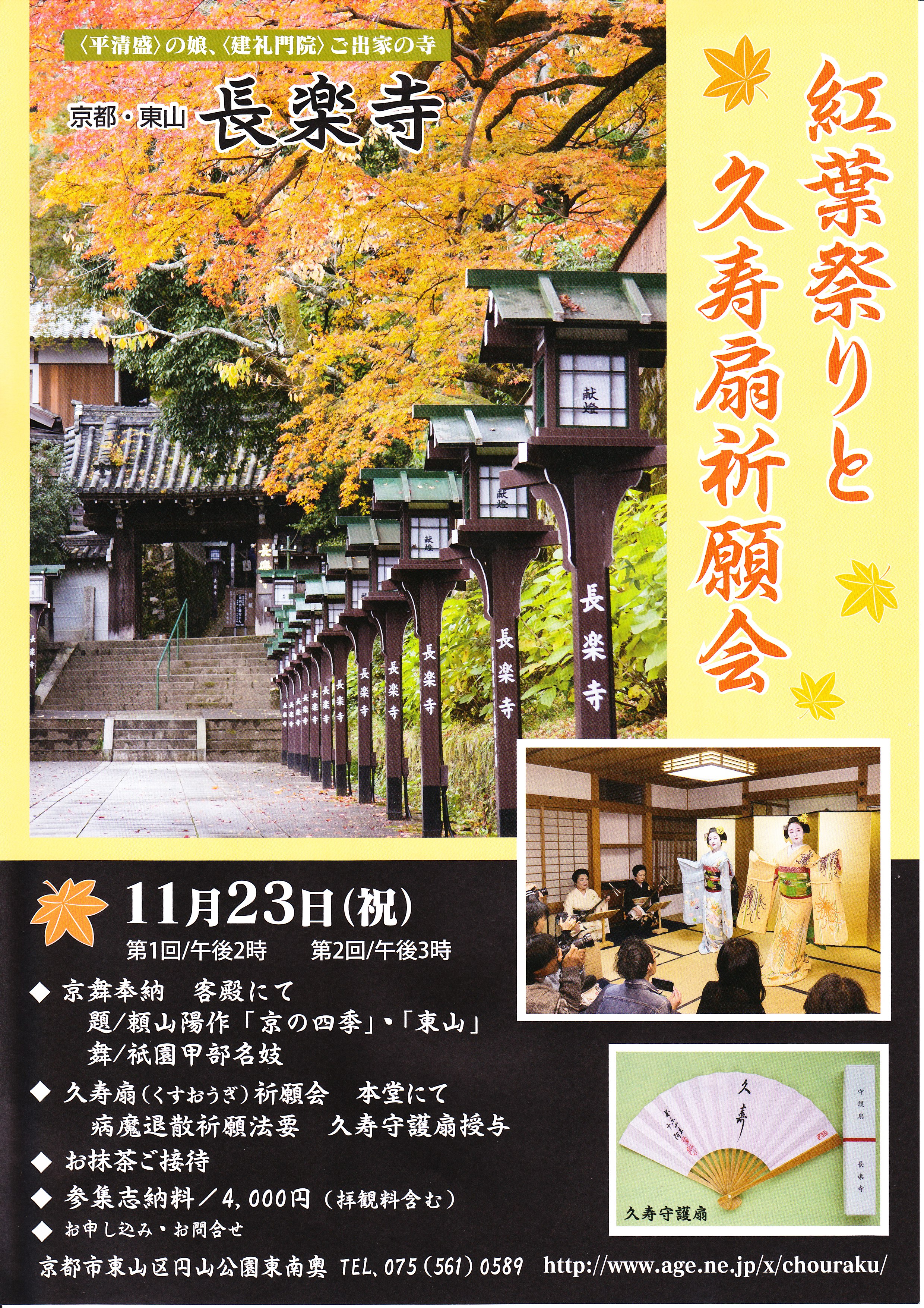 紅葉祭りと久寿扇祈願会 <平清盛>の娘、<建礼門院>ご出家の寺 京都・東山 長楽寺 平成30年11月23日(祝) 第1回/午後2時 第2回/午後3時 ◆京舞奉納 客殿にて 題/頼山陽作「京の四季」・「東山」 舞/祇園甲部各妓 ◆久寿扇(くすおうぎ)祈願会 本堂にて 病魔退散祈願法要 久寿守護扇授与 ◆お抹茶ご接待 ◆参集志納/4,000円(拝観料含む) ◆申し込み・お問合せ 京都市東山区円山公園東南奥 TEL,075(561)0589 https://www.chorakuji.or.jp/